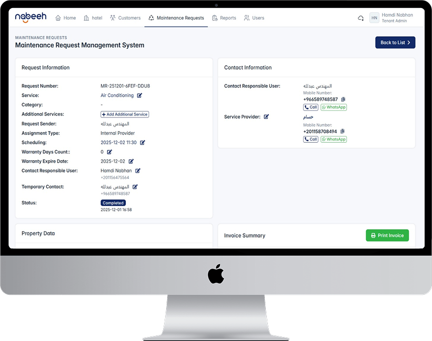 Nabeeh provides maintenance and operations companies with a complete operations management system—from receiving the request all the way to closing it—along with reports and invoices.